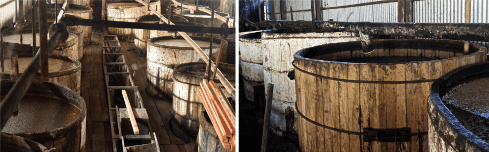 - Fermentation naturelle, Ici, la fermentation dure longtemps, avec de la levure sauvage. On respecte les techniques du XVIIIe siècle, générant une concentration d’esters inégalée (jusqu’à 7000 g/hl, même si la réglementation fixe un maximum à 1600 g/hl). Le « dunder » (résidus de distillation) et la mousse sont intégrés dans ce procédé, perpétuant l’usage des résidus d’anciennes cuvées stockés jadis dans des fosses recouvertes de foin.