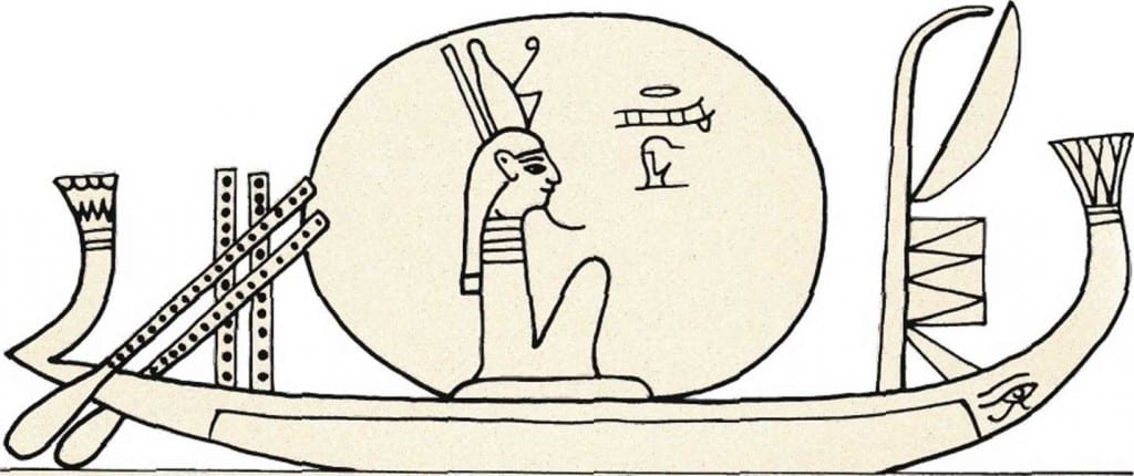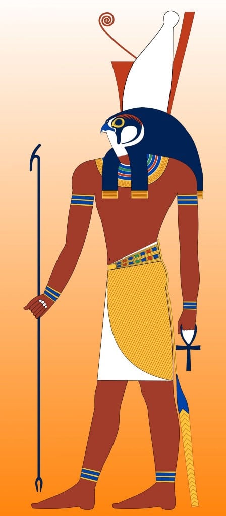 Rê, dieu solaire par excellence, est le créateur du monde et du ciel. Présent dès les origines, il domine le panthéon égyptien. Les pharaons se revendiquaient « fils de Rê », affirmant ainsi leur légitimité. Durant son voyage quotidien, Rê traverse le ciel dans sa barque, affrontant dangers et métamorphoses. Il est généralement représenté sous les traits d’un homme à tête de faucon, orné d’un disque solaire et accompagné du cobra sacré.