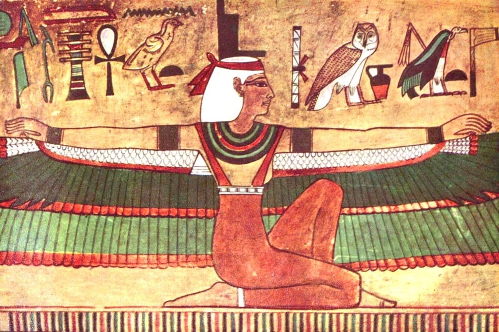 Nout personnifie le ciel, épouse de Geb, la terre. D’abord figure majeure, elle recule dans la mythologie au fil du temps. Les textes la décrivent comme une femme d’une beauté saisissante, étendue au-dessus du monde, abritant les astres et les dieux.